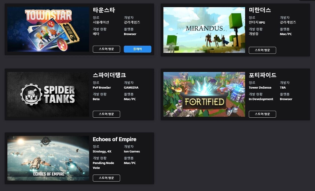 - Gala Games: 사용자는 쉽게 갈라 게임 타이틀에 액세스할 수 있으며, 개발 진행 현황 등을 확인할 수 있습니다. 갈라 플랫폼의 첫번째 게임은 파밍 시뮬레이션 게임인 Town Star이며, 현재 NFT를 소장할 수 있는 VOX를 출시한 상태이다. 추후 판타지 PGR, Sci-fi 전략 게임 등을 추가 출시할 계획입니다.
