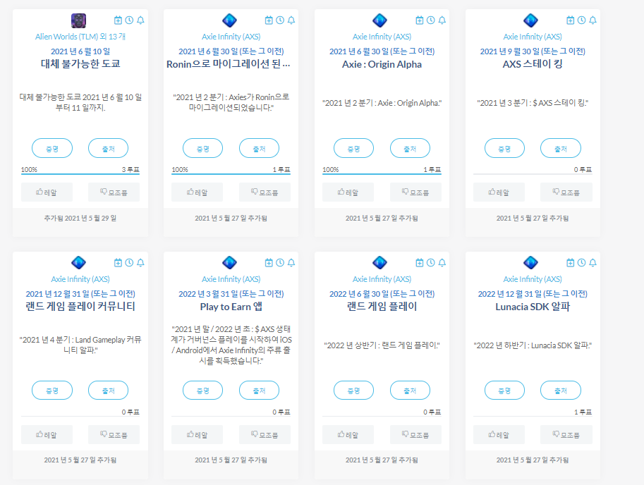 코인마켓 캘린더 웹사이트를 통해 엑시인피니티 주요 일정을 찾아보았는데요 윗 사진 처럼 많은 일정등이 나와있었습니다앞서 말했듯이 비트코인이 떨어지고 있는 중아무리 좋은 호재를 앞두고 있는 코인이라 하여도호재가 '화제'악재가 되는 경우도 있으니 시장 상황에 대해 전반적으로 분석하고 투자하시는 게 좋을 듯합니다