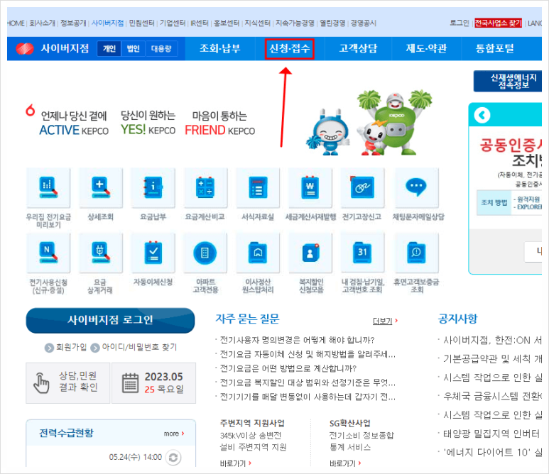이는 '한국전력공사 사이버지점' 홈페이지에서 신청할 수 있습니다. 검색을 통해 이곳을 들어오신 다음에, 초반 화면 '위쪽'에 있는 메뉴 중에서 '신청, 접수'라고 써진 글씨를 클릭해 보세요.