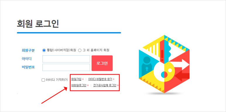 누르고 나면, 이렇게 '회원 로그인' 창이 나오는데요. 우선 이곳에 본인의 '한전 사이버지점 계정'을 입력해 보시길 바랍니다. 혹시 관련 계정이 없으면, 그 아래에 있는 '회원가입' 버튼을 눌러서 계정을 새롭게 만들어보세요.