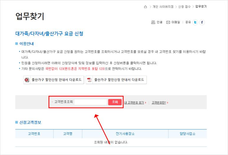 계정 로그인을 하면, 이렇게 대가족, 다자녀 요금 신청 페이지가 나오게 됩니다. 이때 여기서 우선 위쪽에 있는 '고객번호 조회' 부분에 본인 집에 '고객번호'를 입력해 보세요. 혹시 관련 고객번호를 모르는 분들은, 그 옆에 있는 '내 고객번호 찾기'를 클릭하면 고객번호를 확인할 수 있습니다.