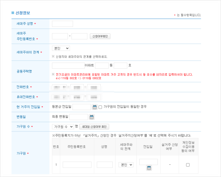 고객번호를 적은 다음부터는 아래쪽에서 구체적인 신청 정보를 적으시면 되는데요. 이곳에 세대주 이름, 주민번호, 세대주와의 관계, 공동주택 이름 등을 적어보시길 바랍니다.