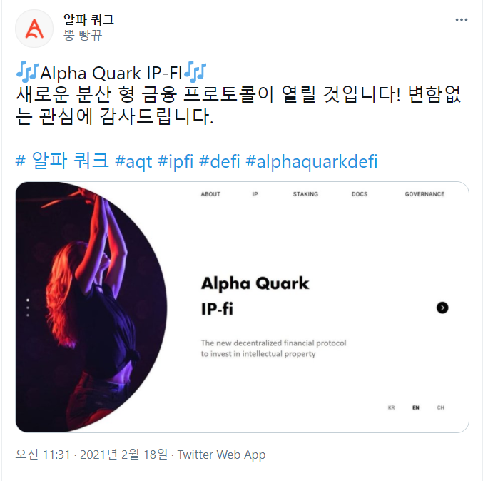 알파 쿼크는 올해 상반기 중 IP-fi 분산형 금융 프로토콜을 런칭할 예정이라고 합니다